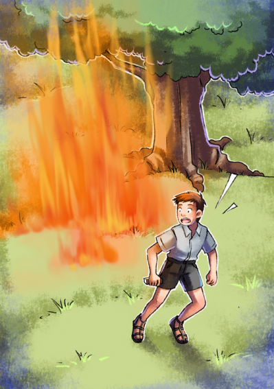 Parce que le feu commence à se propager aux herbes sèches et des flammes se mettent à grandir au pied de l’arbre.