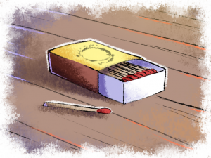Frotte l’allumette d’un petit coup sec contre la bande marron du côté… Du premier coup, de nulle part, il voit apparaître la flamme jaune. Magique !