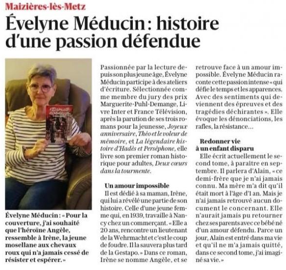 Jeune auteure autoéditée et autodidacte de soixante-quatorze printemps, Évelyne est née à Ars-Sur-Moselle un 16 septembre. Passionnée par la lecture depuis son plus jeune âge, elle a eu l’honneur d’être sélectionnée pour être membre du jury du Livre Inter et du prix littéraire France Télévision.